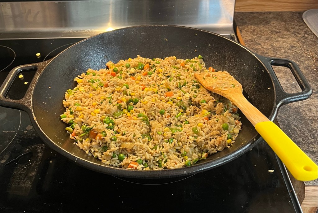Put cooked rice into wok. Measure out 2 Tablespoons of oyster sauce, 1 Tablespoon of toasted sesame oil, and 6 Tablespoons of soy sauce. Stir well into the rice, and cover with lid. Reduce heat to medium.