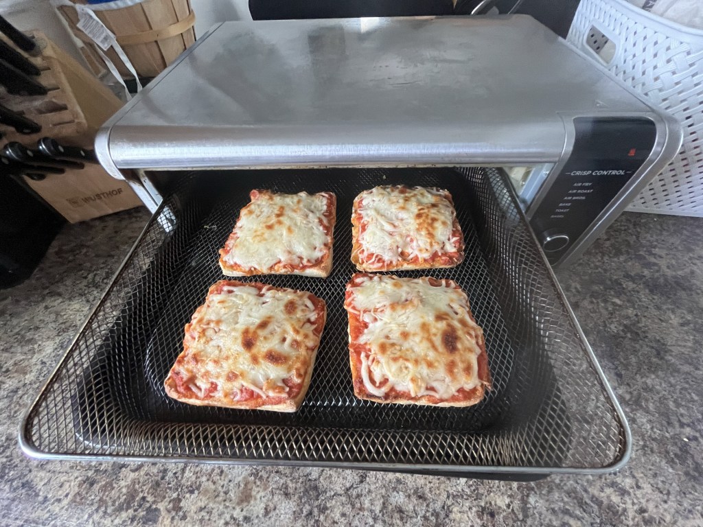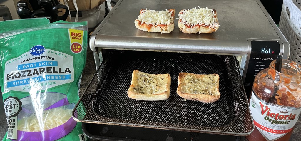 Now open a jar of pasta sauce or marinara sauce. Use a spoon to spread some on the bread you just grilled. Sprinkle some grated cheese on top… I prefer mozzarella or white cheddar. Put the bread back onto your air fryer rack, and bake about 7 minutes at 400 degrees. I used the Air Roast setting.