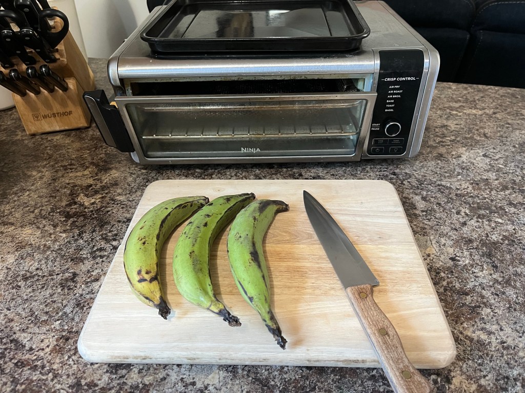 Plantains look a lot like bananas, but they must be cooked before eating. Sweet, fully ripe plantain is soft, or mushy, and can be baked much like summer squash, or yams. It tastes good with a little brown sugar and honey. I’m not doing that here. Sorry.