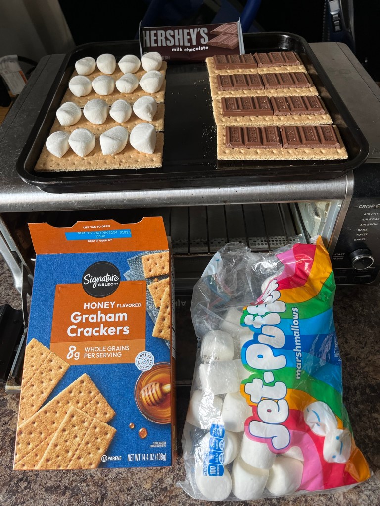 As long as you got the three simple ingredients, you’re good to go. Do it in your air fryer! Lay out the Graham crackers on the baking pan. Put the chocolate on one side, and the marshmallows on the other. For this recipe, I used Jet-Puffed marshmallows, sliced in half.