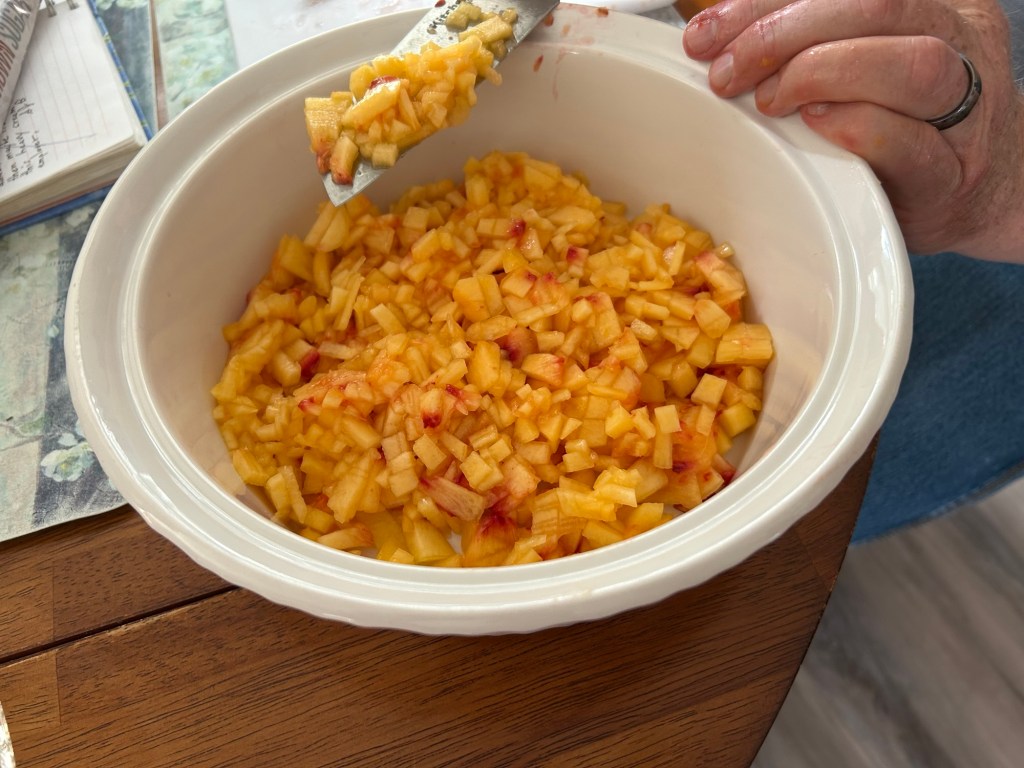 Not every nectarine tree produces the exact same size of fruit. And not every grocery store sells the exact same sizes of fruit. So the photo above gives you an idea of what size fruit I’m working with. These nectarines are huge, and firm. Not mushy. I peeled four, and diced the fruit into small morsels. I stirred in a cup of brown sugar, and the juice of one lemon.